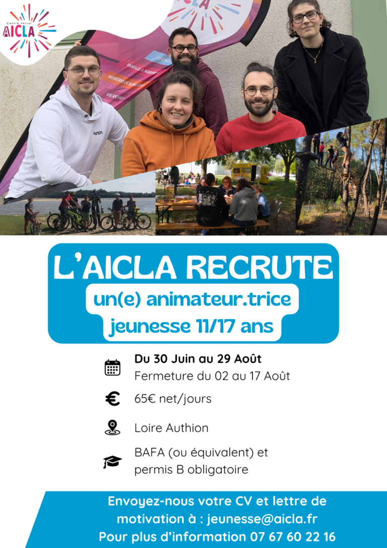 Différents profils recherchés : animateurs.trices en ALSH 12/17ans, animateurs de séjours. Implantée sur la commune de Loire-Authion depuis plus de 20 ans, l’AICLA (anciennement AIDAL) est une structure d’accueil multi-sites ouverte à tous les habitants de la commune. Association d’Éducation Populaire et Centre Social, l’AICLA développe un projet d’animation qui favorise le vivre ensemble.