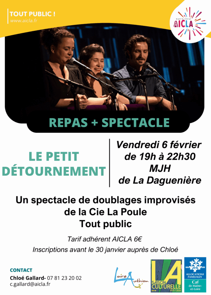 Envie de découvrir le spectacle "Le petit détournement" de la Cie la Poule. Nous vous proposons une soirée repas à la MJH de la Daguenière puis le spectacle à la…